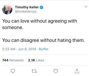 Keller makes the point that I’m trying to make here: I can disagree with you without hating you. Just because I don’t agree with your view doesn’t mean I don’t love you as a fellow image-bearer of God. We are both people. We both have the same value, worthy, and dignity because God has given it to us–and we should be able to still disagree, even on fundamental worldview issue.